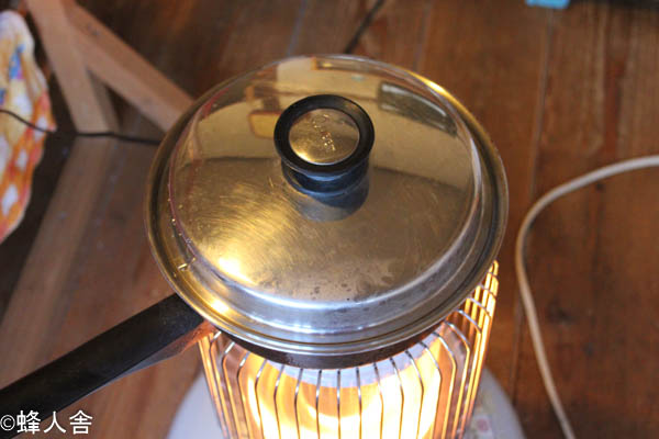 蓋をして加熱します。こうすると水を加えないで、リンゴだけの水分で煮ることができます。